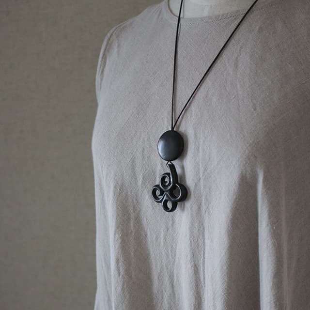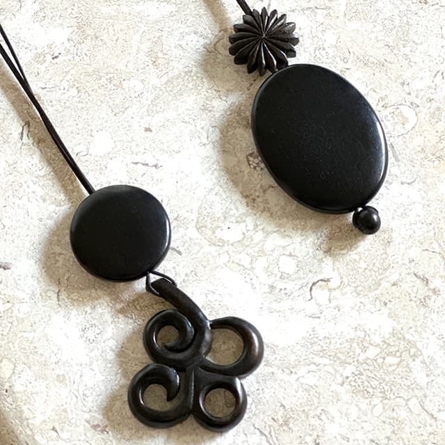 黒檀を使用したこのペンダント、四つのくるりと巻いた葉と円を組み合わせたユニークなデザインが特徴です。クラフトマンが一つ一つ丁寧に作り上げ、多彩な表情を放ちます。