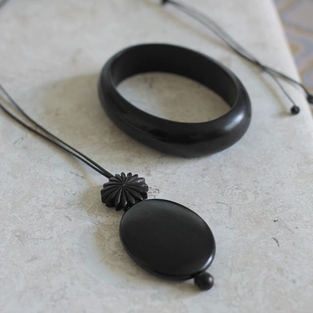 This pendant is a beautiful piece combining an elliptical section crafted from ebony with a small flower design.