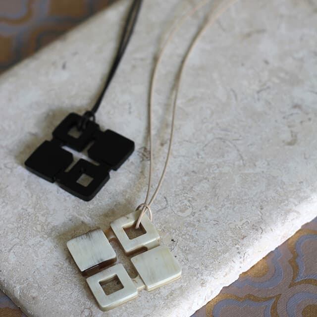 This sophisticated pendant features four square components crafted from black water buffalo horn, connected together.
