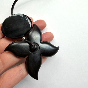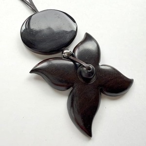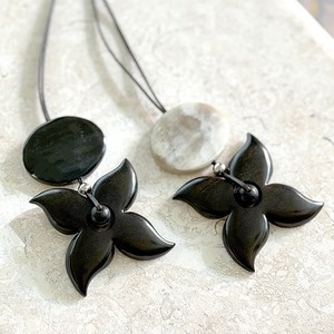 黒檀とバッファローホーンを使用したこのペンダント、星を感じさせる花びら型の黒檀と楕円形のホーンを組み合わせた印象的なデザインが特徴です。二つの間にはステンレスのビーズが静かに輝きます。クラフトマンが一つ一つ丁寧に作り上げ、多彩な表情を放ちます。
