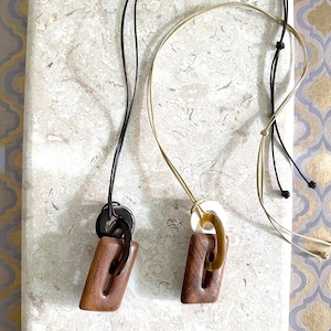 長方形のrosewoodとhoop形の黒いバッファローホーンを繋げると、素敵なペンダントに仕上がりました。ゆらゆら揺れる感じも素敵です。