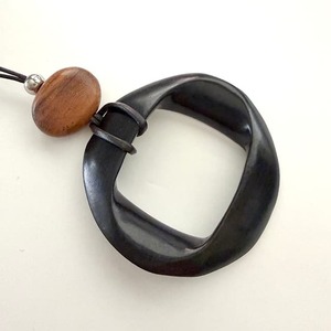 This ribbon pendant is carved from ebony into a shape resembling a wrapped ribbon.