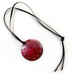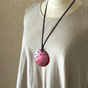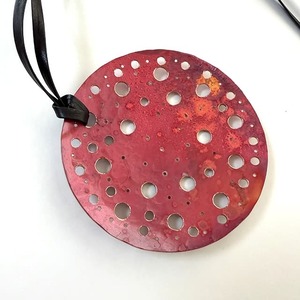 円形の銅板を鍛金という技法で緩やかな丸みをつけ、伝統着色し透かしを施したペンダント。